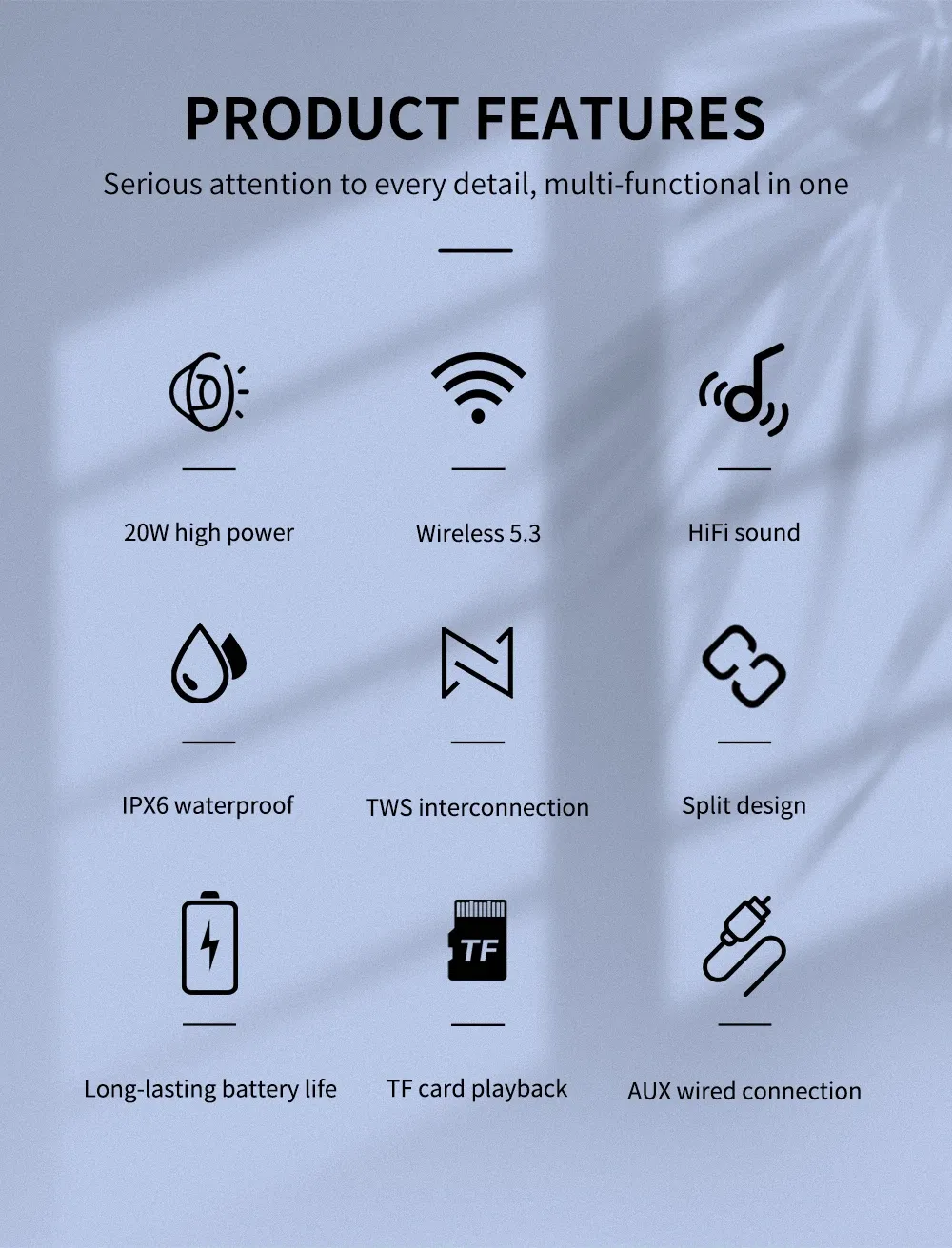 2 in 1 Portable Split Wireless Speaker, IPX6 Waterproof Portable Speaker with RGB Lights TWS Pairing for Outdoor, Home