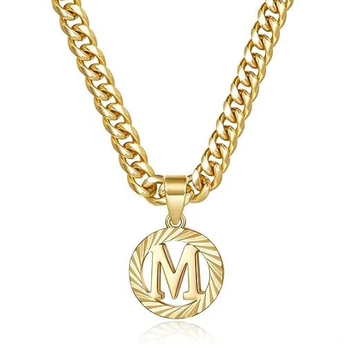 New Arrivals Gold Plated 26 Letter Pendant Chunky Necklace Stainless Steel Hollow Round Initial Letter Cuban Link Chain Necklace